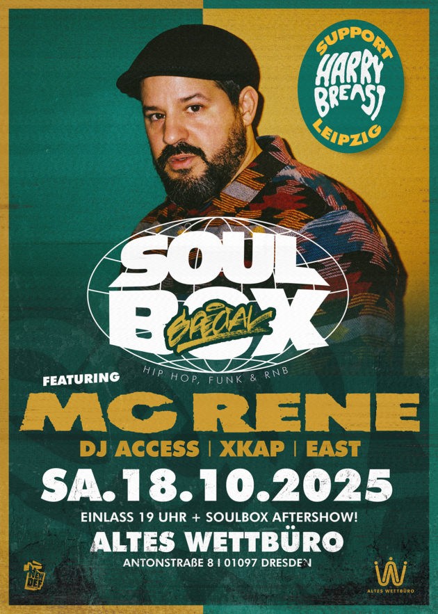 Wir ziehen im Oktober wieder in unser Wohnzimmer und machen es uns mit der Rap-Legende MC RENE gemütlich. Schon lange auf zahlreichen Bühnen und Releases unterwegs, begeistert er nun auch seine Fans im Alten Wettbüro!