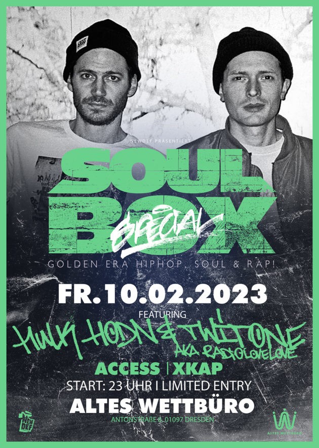 Wir starten 2023 mit viel Liebe und haben Euch „Radio Love Love“ aka Hulk Hodn & Twit One nach Elbflorenz eingeladen! Die Beiden sind aus der Szene als Produzenten, DJs und Hosts kaum mehr wegzudenken! Überzeugt Euch selbst in der Nacht der Nächte!