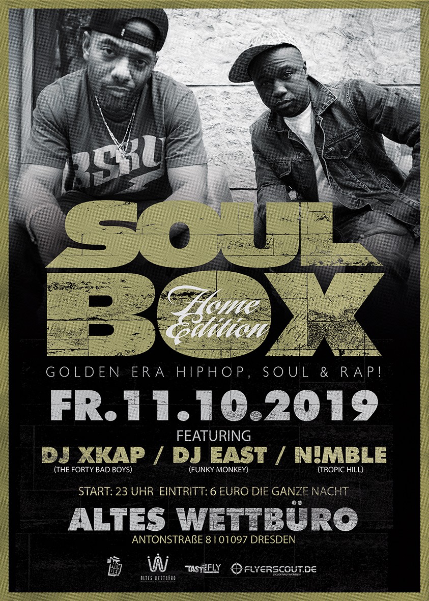 Wir starten frisch in den Herbst mit einer neuen Soul Box Home-Edition. Dabei sind die Local-Heros Xkap, east & Nimble von Tropic Hill, die eine bunte Mischung aus Rap-Klassikern, Soul, Funk & Deutschrap spielen. Kommt vorbei ins schönste Wohnzimmer der Stadt!